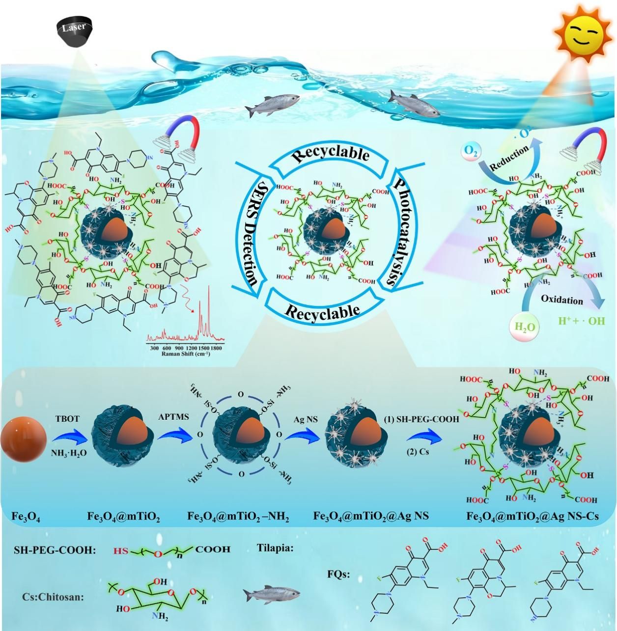 该工作设计了具有自校正与自清洁功能的表面增强拉曼散射(SERS)活性纳米复合材料,为FQs的无标记定量检测与降解提供了新的研究视角。利用介孔二氧化钛(mTiO2)与银纳米星(Ag NS)的协同增强效应,成功开发了多元复合功能的Fe3O4@mTiO2-Ag NS-Cs SERS基底,实现了对湖水和鱼类样品中FQs的高灵敏比率SERS检测。在该基底中,得益于Ag NS之间以及mTiO2-Ag NS界面处的电磁场放大作用,“热点”密度被显著提升;同时,半导体mTiO2与Ag NS形成界面后,能有效促进电荷转移,驱动大量界面电子转移至靶标分子FQs。引入的-COOH基团以及修饰壳聚糖(Cs)后含有的丰富活性基团(-NH2和-OH),加强了靶标分子对基底表面的亲和力,将其有效锚定于“热点”区域。基底优异的磁响应性能有助于吸附靶标后的快速磁富集,并有利于磁场辅助SERS检测进而有效避免咖啡环效应。该研究充分利用mTiO2在149 cm⁻¹处的本征拉曼响应作为内标,提升了SERS定量检测的准确性。此外,该基底在90 min内可实现FQs的高效绿色降解,为复杂基质中FQs的无标记高效分析提供了理想传感平台。