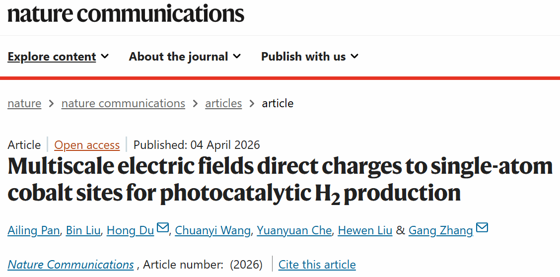 2026年4月4日世俱杯2025(亚洲)官方网站 杜虹教授团队在学术期刊《Nature Communications》在线发表了题为“Multiscale electric fields direct charges to single-atom cobalt sites for photocatalytic H2 production”的学术论文。