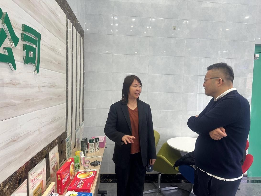 图2 潘浩波研究员参观新奇康药业产品陈列展